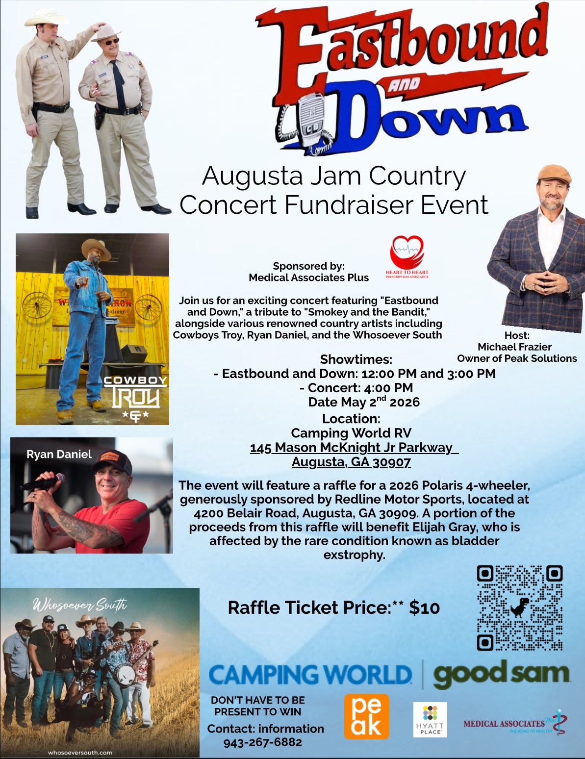 Catch Whosoever South lighting up the stage at the Augusta Jam Country Concert Fundraiser on May 2, 2026, at Camping World RV Sales in Augusta, GA, where performances kick off at 4 p.m. with their signature blend of heartfelt Southern country vibes. This feel-good event doubles as a powerhouse fundraiser, channeling proceeds and $10 raffle tickets for a sleek 2026 Polaris 4-wheeler straight to young Elijah Gray’s fight against the rare bladder exstrophy condition—proving once again that great music can fuel real change.